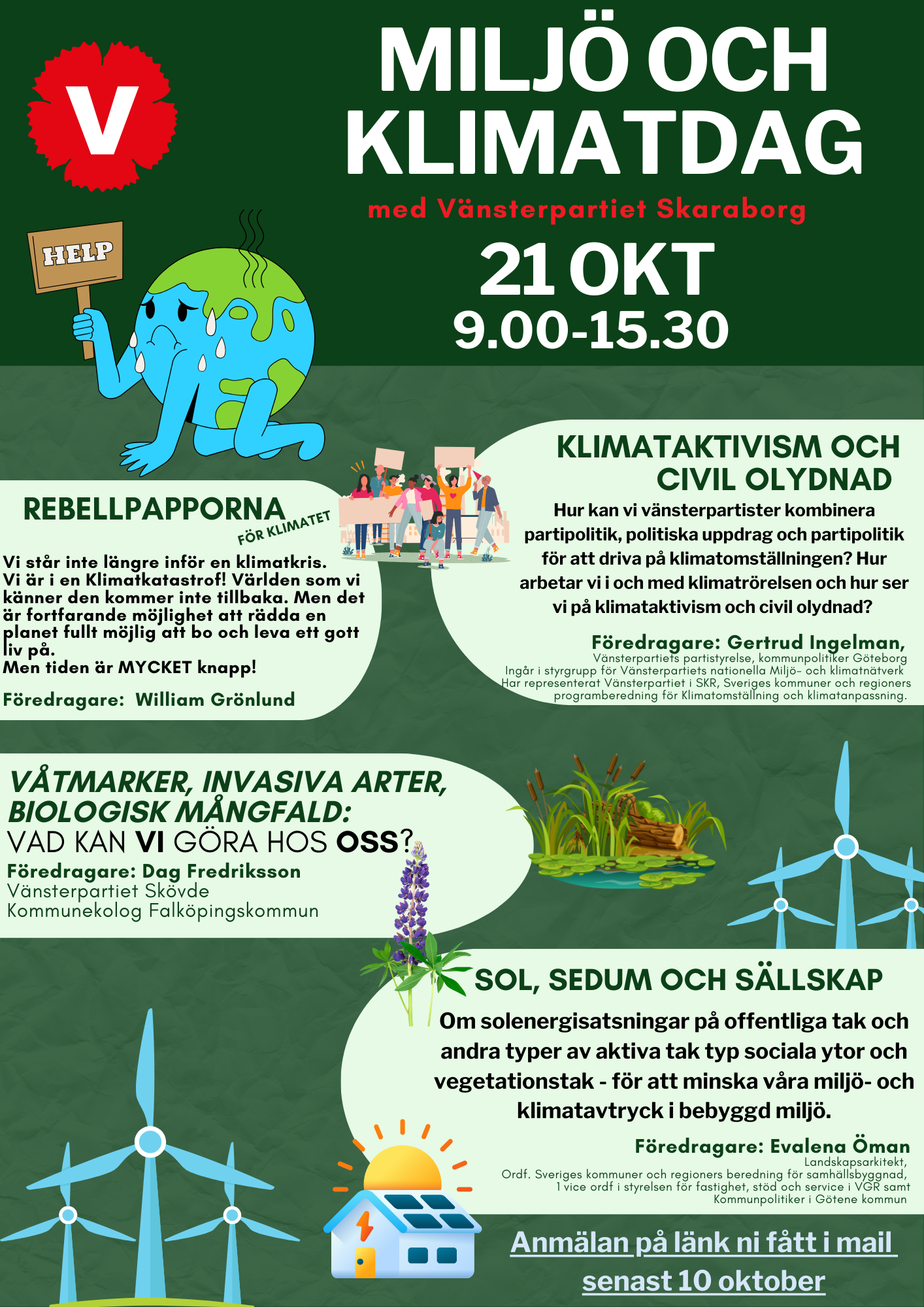 Miljö och klimatdag på Axevalla folkhögskola med samtal och inspiration av bland annat: Gertrud Ingelman, Kliamtaktivism och Partipolitik Evalena Öman, Sol, Sedum och Sällskap Dag Fredriksson, Naturvård, vad kan VI göra? Rebellpapporna Örebro Anmäl er här, alla medlemmar välkomna och Distriktet bjuder på fika och lunch! https://events.magnetevents.com/Event/miljo-och-klimatdag-55289/